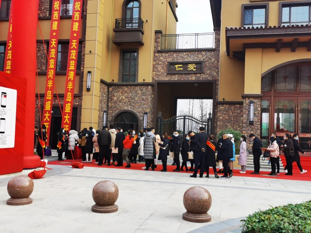冬日早晨還有些清冷,但依然抵擋不住大家的熱情,開盤時間還未到,天茂和郡宴會廳門口早已排起了長龍,大家早早趕來生怕與心儀房源失之交臂,眾多購房者翹首以盼,焦急地等候開盤儀式,共同見證西建·天茂藍灣半島首次開盤的盛況。