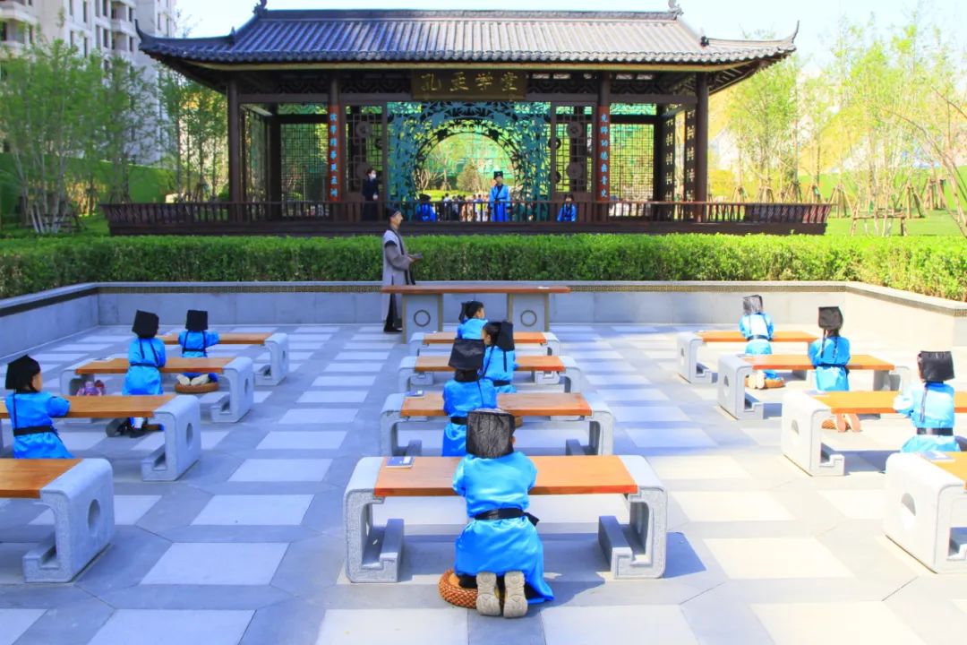 踏入學(xué)堂走到書(shū)案,映入眼簾是勸學(xué)和中庸的書(shū)卷雕塑,隔岸可以看到孔孟學(xué)堂亭,整個(gè)氛圍猶如“孔子講學(xué)”的場(chǎng)景。表達(dá)了西建國(guó)賓府對(duì)小業(yè)主們長(zhǎng)大成龍成鳳的美好愿景。