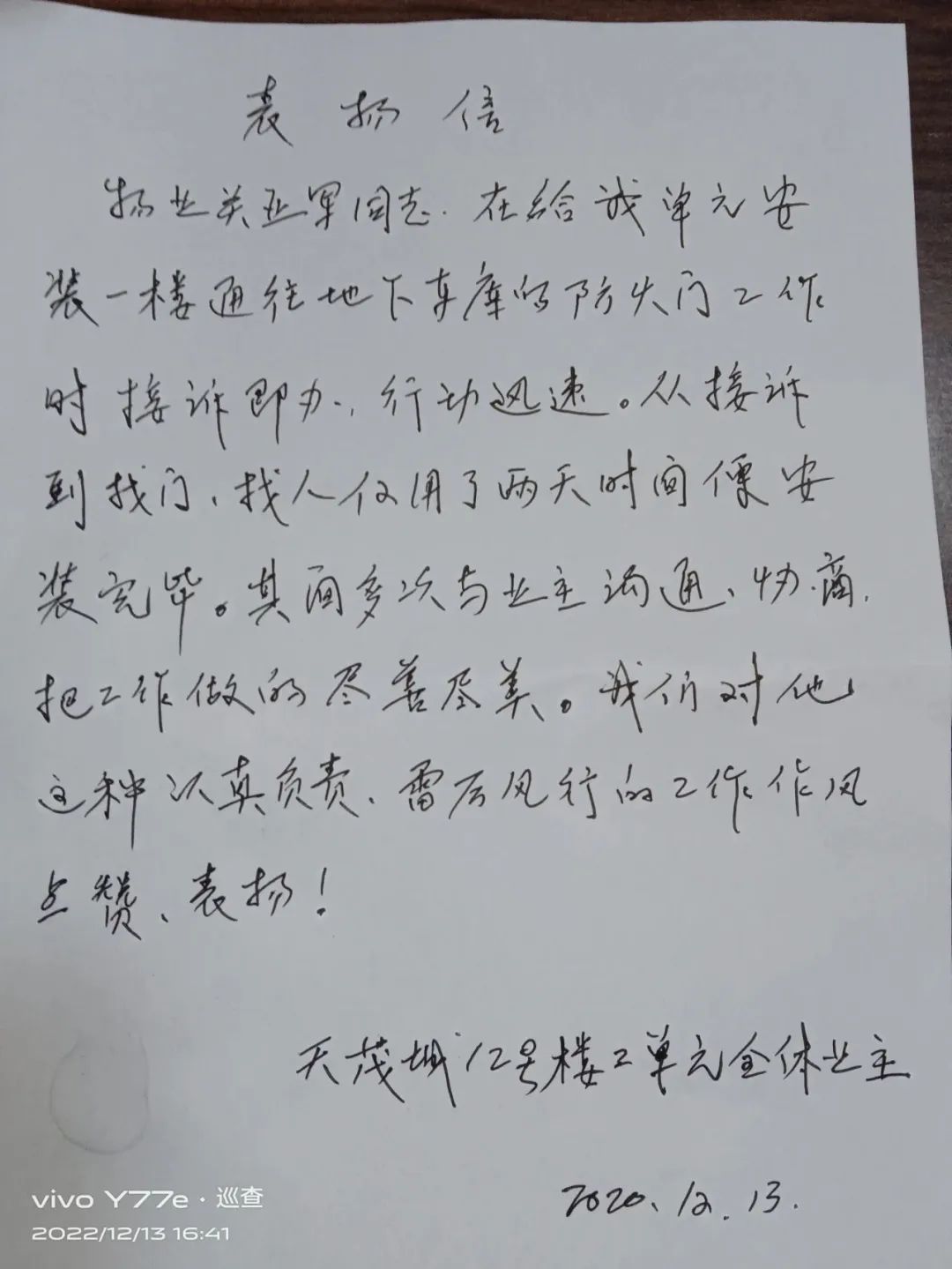 天茂城物業(yè)關(guān)亞軍,對于小區(qū)業(yè)主的訴求盡心盡力,行動迅速,關(guān)亞軍雷厲風(fēng)行、盡善盡美的工作作風(fēng),獲得了12號樓2單元全體業(yè)主的聯(lián)名點贊。