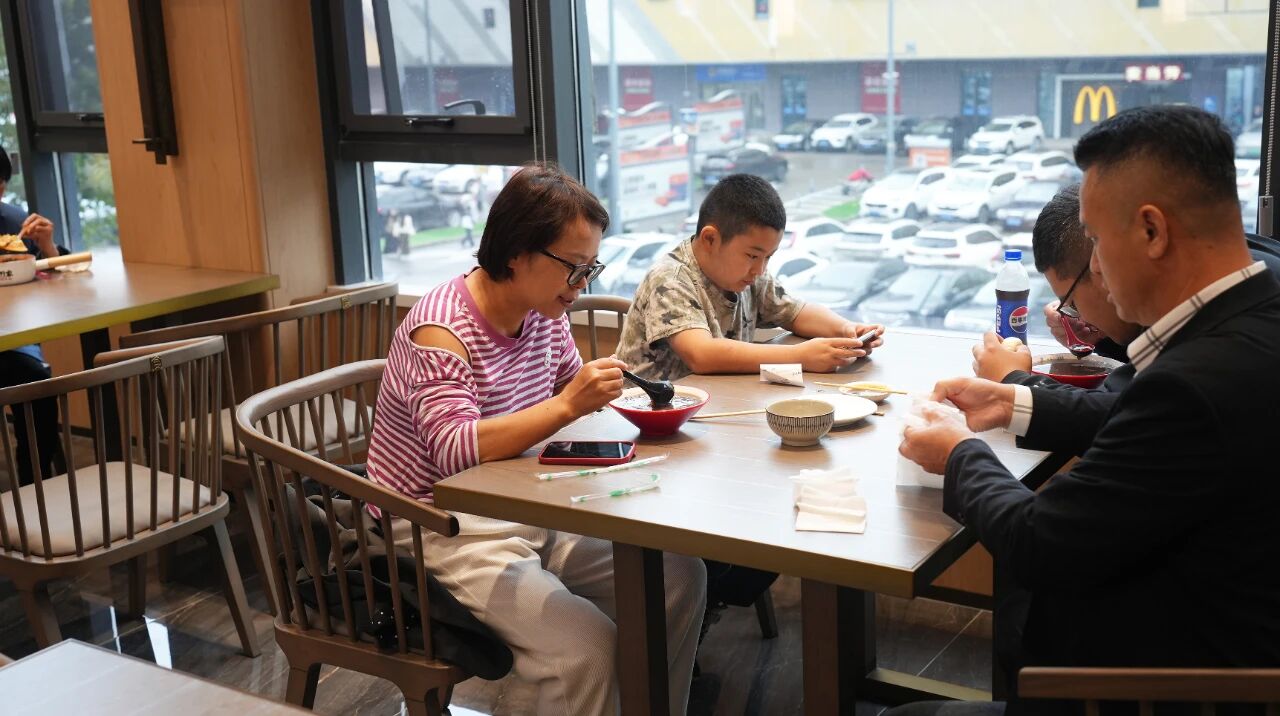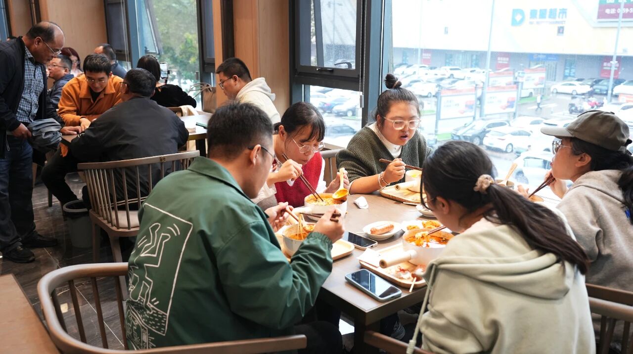 另一邊的少野家鍋鍋米線同樣熱度不減,酸湯肥牛湯底咕嘟冒泡,米線吸飽湯汁,搭配軟糯的豆皮、鮮美的青菜,麻辣鮮香的口感讓人直呼過癮。