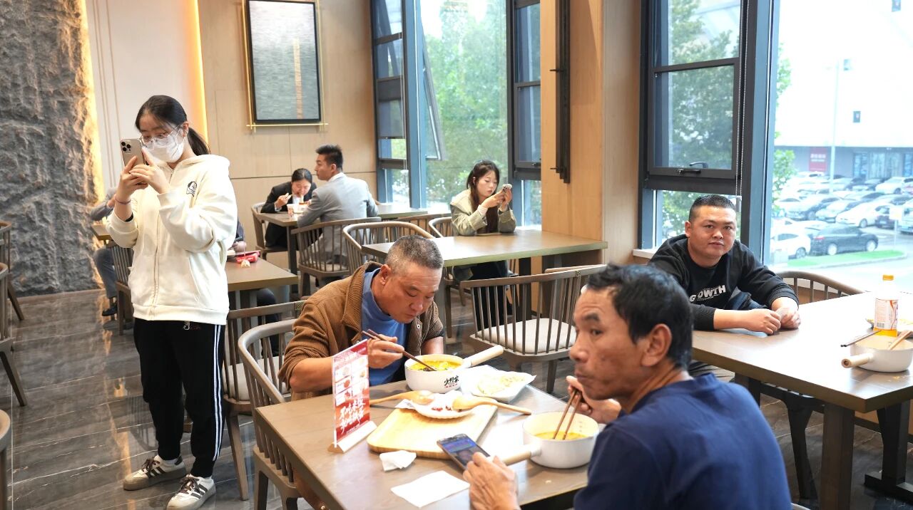 走進國賓小館,四大特色美食檔口前更是人氣爆棚。鐵蛋刀削面檔口前,師傅手持面團行云流水般削面,薄厚均勻的面條落入沸水,撈出后澆上秘制鹵汁,搭配鮮嫩澆頭,一口下去筋道入味,引得食客頻頻稱贊。